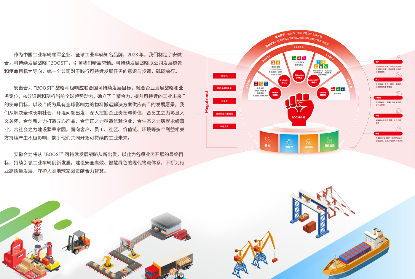 合力叉車將秉持“世界五強(qiáng) 百年合力”的企業(yè)愿景,以“變革、創(chuàng)新、開放、合作”為動(dòng)力,致力于成為全球叉車專家及中國(guó)自動(dòng)化物流設(shè)備供應(yīng)商。